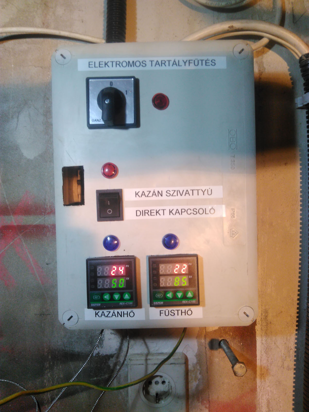 Puffertartállyal kombinált szilárd tüzelésű kazánnal, és elektromos fűtőbetéttel is fűthető rendszer, vezérlő egysége. A teljes fűtésrendszer épp úgy, mint ez a vezérlő, saját tervezés és kivitelezés.