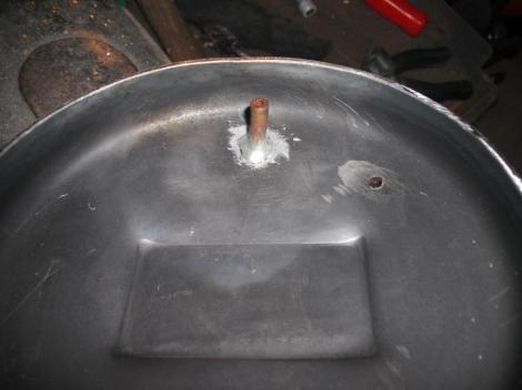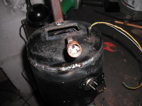 Közben itt az utolsó képen, meg talán az elsőn azt is láthatjuk, hogy a hengerfejből az elején már emlegetett kis pipaszerű vagy alakú rézcsövecske áll ki. No, hát azon keresztül szívja a levegőt, addig a kompresszor motorteréből. Most viszont mi majd azt, meg a korábban felcsonkozott, a fedélen lévő kivezetést össze fogjuk kötni valami rugalmas, mondjuk gumicsővel, és úgy hegesztjük le a végén a fedelet. Ezzel biztosítva a kintről történő szívást. De előbb egy kis praktikum.