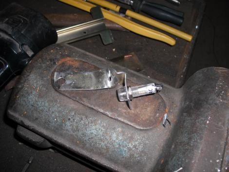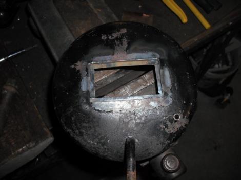 Egy pontosan bele méretezett plexi jó is lehet, de annak akkor is fel kell feküdnie egy folytonos peremre. Már csak azért is, mert az olaj minden létező résen átmászik, legyen az akár milyen kicsiny is. Muszáj lesz olajálló sziloplasztba ágyazni a plexit, és a maradék réseket is kikenni. Na ehhez lehet jó valami vékony és nem túl széles anyag, amit belülről felhegeszthetünk az ablak széleire. Nekem nagyon jól bevált a régi „antik” ruhásszekrények zárrúdja. Az, ami középről a zártól fel is meg le is végig megy az ajtón belül egy burkolat mögött, és záráskor egy fészekbe szaladva rögzíti a szekrényajtót. Nekem bontásból (szekrény szétvágás tűzifának) maradt vas alkatrész, amit annak idején nem dobtam ki, „jó lesz az még valamire” jelszóval bekerült a turkálóba. Jó is lesz!!! A megfelelő méretű darabók bevágásával felhegesztésével egy folytonos perem képezhető. Így: