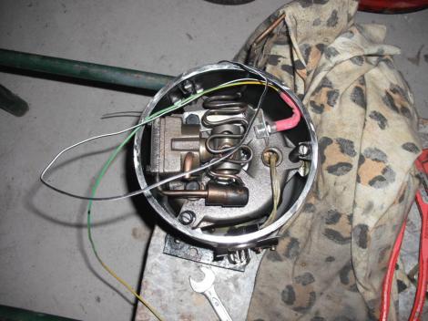 Bele való lámpa megválasztása. Az izzószálas izzók nem jöhetnek szóba semmi képen sem. Bent egy nagyon intenzív rezgés zajlik az alternáló mozgás miatt. Nem véletlenül van az egész szerkezet rugókon keresztül a házhoz csatlakoztatva. Egy ilyen rezgés rövid időn belül elszakítaná a wolframszálat, még akkor is talán, ha magához a házhoz erősítenénk a lámpát. De szerencsére van nekünk a glimmlámpánk. Most egy tokozott változat került a kezembe a turkálóból. Ez jó, mert könnyű rögzíteni egy körfuratban, ugyanakkor az sem baj, ha az olaj a tokozásába bejut. Hisz a glimmlámpa test ettől még légzárt. Az olaj meg elektromosan nem vezető, hanem inkább igen jó szigetelő (gondoljunk csak a transzformátorok hűtőolajára…) A vezetékeket olyan hosszúra kell választani, hogy azok bőven kiérjenek az elektromos csatlakozó dobozig a kompresszor test oldalán. Nekem itt egy görbe vaslemezt sikerült befognom a célra, aminek a végét a hengerfej egyik lefogató csavarja alá tehetek. Így a lámpa szórt fénye megy mindenhova, de az irányított része, amiről nem vagyok meggyőződve, hogy egy lézerkard irányítottságával felvenné a versenyt, az rávilágít a dugattyúra.