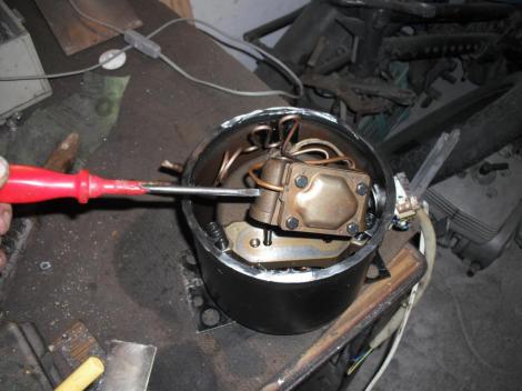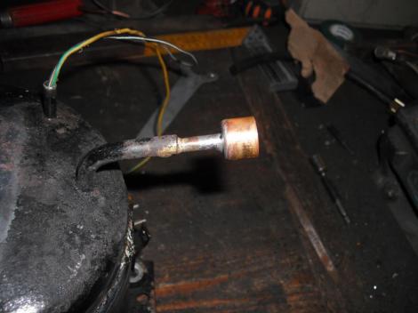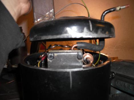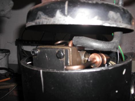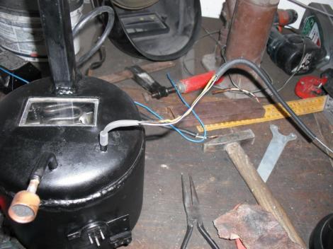 A kompresszorokon általában 3 csőkivezetés van. Egyiken érkezik vissza a körből a gáz, a másikon megy előre nagy nyomással, a harmadik meg egy lezárt csonk, amin a gáztöltést végzik gyárilag (vagy utántöltésben?) Én mindhármat felhasználnám. Egyiken történik a beszívás a másodikon a kifújás. A harmadikat meg egy kis extrához használandó fel. Mit is gondoltam ki? Arra gondoltam, ha már annyian csináltak előttem hasonló eszközt, nekem akkor is ki kell találni valamit, amitől legalább kicsit más lesz tőlük. Semmi hasznos nem jutott az eszembe, hát elővettem a jó öreg designe kérdést. Lámpa kell bele! Legyen nyitott a szemnek, és láthassam is, ami üzem közben benne történik. Na, hát erre kell a harmadik kivezetés, Ami bevezetés lesz a világítás számára, a vezetékének. De elsőnek is az alanyból, a motorból ki kell önteni az olajat, hogy a szétvágásakor már ne maszatoljon. A visszatérő ágon szép lassan hajlandó is kifolyni. Érdemes felfogni, mert a bennük lévő olajfajta egy speciális, ide való. Nem habosodó fajta. És a benne lévő mennyiség is fontos, nem jó, ha túl sok van benne, de még kevésbé ha kevés.