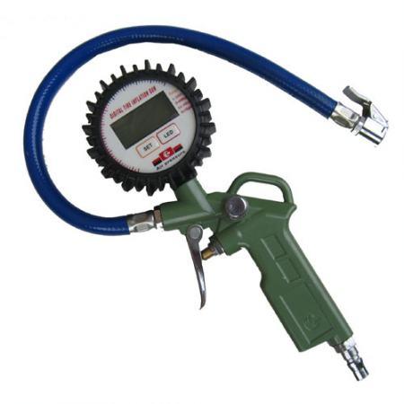 És ha olyan a mérőórája van a forrásnak, amin átmenő, azaz ki-bemenetű a tömlőcsatlakozás, akkor mehet be egy ilyen óra is a tömlő valamely szakaszába. Ezekben az órákban van mindjárt egy visszacsapó szelep, amiről itt szeretném jelezni, nagyon fontos kellék. Visszacsapó nélkül ne csináljuk kerékfelfújót. Kell bele mindenképp! Miért? Mert ha csatlakoztatjuk a kerékre, amiben már van 1-2 bar nyomás, akkor az visszahat a kompresszor hengerfejére, a dugattyúra. Nyomás alatt biztosabb, hogy nem fog tudni elindulni a motor. Jó esetben csak leoldozgat állandóan a hővédő, és pont az előbb már említett jelenséget produkálja. Ha egyszerű megoldást keresünk, akkor a legegyszerűbb vásárolni egy órával egybeépített komplett légtechnikai kelléket, egy kerékfújó pisztolyt. (még ha nem is feltétlen a képen látható digitális változatot…)