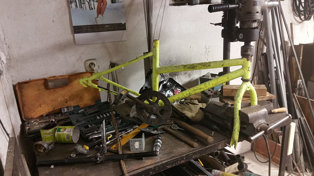 Végy egy lemezt, furatai alat készíts egy betonozható vasalatot, közepére hegesszél egy bontóból szerzett autó rugót és vidd el mindezeket festésre. Amíg a festés elkészül az össze lomizott rossz gyerek biciklit szabdald szét, a kormányát ülését megtartva hegessz neki egy lábtartó és egy helyet a vázon ahova a lefestett rugós talp felerősíthető. Amíg a beton megköt addig az áthegesztett bicikli rész festése is megszárad. Egyetlen feladat eddig valahogy visszatartani a gyereket a használattól! De utána el szabadulhat a pokol!!!